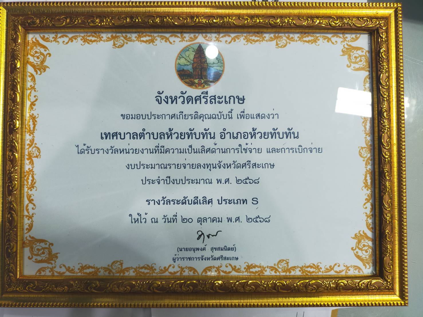 วันอังคาร, 28 ตุลาคม 2568 14:41วันที่ 29 ตุลาคม 2568 เวลา 09.00 น. เทศบาลตำบลห้วยทับทัน โดยนายมนรัตน์ แสงสว่าง รองปลัดเทศบาล รักษาราชการแทนปลัดเทศบาลตำบลห้วยทับทัน เดินทางเข้ารับรางวัลประกาศเกียรติคุณ"หน่วยงานที่มีความเป็นเลิศด้านการใช้จ่าย และการเบิกจ่ายงบประมาณรายจ่ายลงทุนจังหวัดศรีสะเกษ ประจำปีงบประมาณ พ.ศ.2568 รางวัลระดับดีเลิศ ประเภท S" จากท่านผู้ว่าราชการจังหวัดศรีสะเกษ ณ ห้องศรีพฤทเธศวร ชั้น 5 ศาลากลางจังหวัดศรีสะเกษ ซึ่งมีหน่วยงานที่ผ่านเกณฑ์การประเมินทั้งหมด 39 หน่วยงาน เป็นเกียรติประวัติสืบไป.